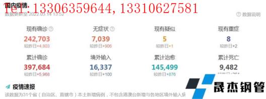 截止3月14日下午1點52分,全國現(xiàn)有確診病例242703例,較昨日新增4803例,無癥狀感染者7039例,較昨日新增906例。目前確診病例集中在吉林、長春、青島、深圳、寶雞、天津、上海、廊坊、滄州、西安等地,上述地區(qū)及周邊關(guān)聯(lián)地區(qū)不斷上調(diào)防控疫情等級。
